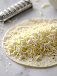 Step 3: Spread a thin layer of refried beans on half of each tortilla, then sprinkle shredded cheese.