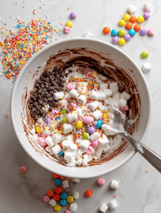 Step 4: Add chocolate chips, mini marshmallows, and any extras like sprinkles or candies. Mix until evenly distributed.