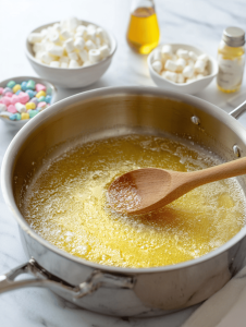 - Add mini marshmallows to the melted butter, stirring constantly until they melt completely, creating a smooth, gooey mixture that bubbles softly and smells sweet.