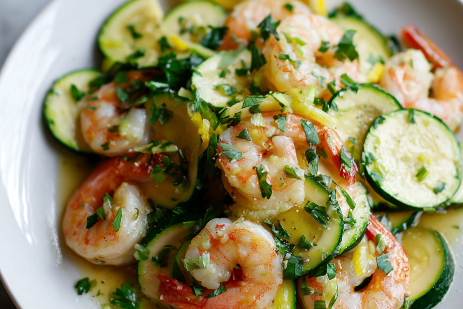 Focusing on how the fresh, slightly sweet shrimp contrast with the subtly earthy, tender zucchini, this dish highlights the balance of oceanic and garden flavors, making it perfect for a quick, bright summer meal.