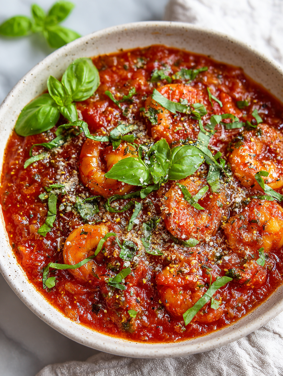 Let the shrimp rest for 2 minutes before serving. Finish with a drizzle of olive oil and fresh basil. Serve immediately over hot pasta, ensuring the sauce is still bubbling and fragrant.