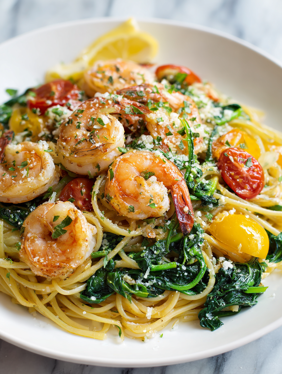 - Serve immediately, garnished with extra lemon wedges or herbs if desired. The dish should look vibrant, with pink shrimp, bright green spinach, and glossy pasta ready to enjoy.