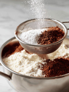 - Sift together the flour, cocoa powder, baking soda, and salt in a large bowl until well combined and light.