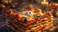 This Halloween-inspired pizza features a crispy crust topped with spicy tomato sauce, gooey mozzarella, and creatively arranged black olives and red bell peppers to create creepy eyes, tongues, and scars. The dish combines simple baking techniques with playful decorating, resulting in a visually haunting and delicious meal that’s fun for all ages.