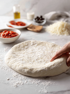 2. On a lightly floured surface, roll out your pizza dough into a roughly 12-inch circle, aiming for an even thickness. This helps create a crispy, well-baked crust.