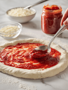 Step 3: Spread a thin layer of tomato sauce over the dough, leaving a 1-inch border.