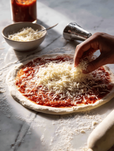 5. Sprinkle shredded mozzarella cheese evenly over the sauce, covering the entire surface for that gooey, bubbly melt.