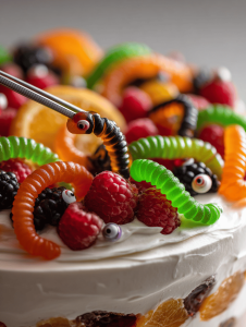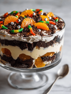 - Decorate the top with gummy worms, placing them so they look like they’re crawling out of the trifle, and add candy eyes for a spooky effect. Scatter berries or orange slices if using.