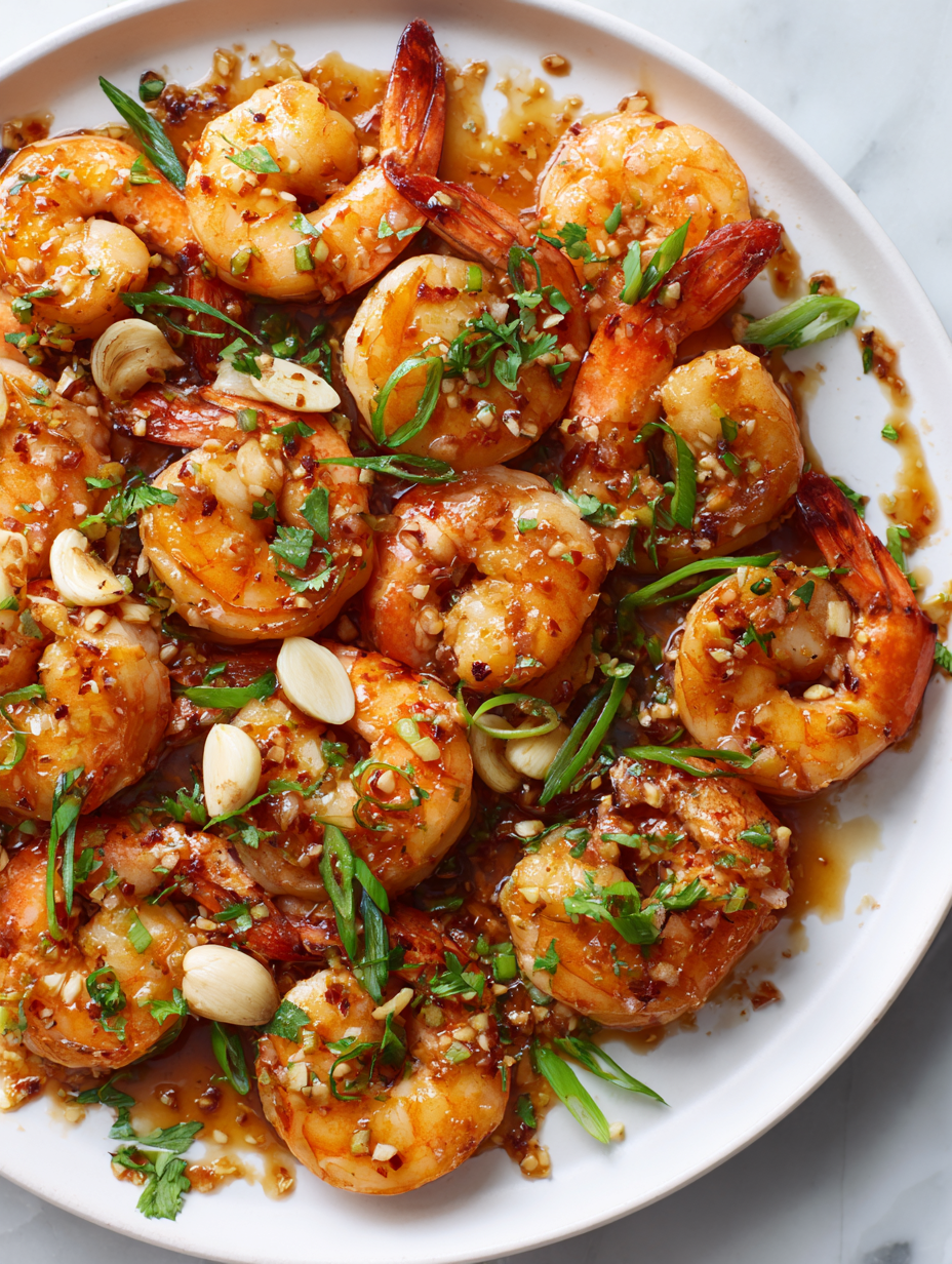 Let the shrimp rest for a minute to settle the sauce. Serve hot, drizzled with any remaining glaze. Garnish with green onions or extra garlic if desired. Plate immediately for the best texture and flavor.
