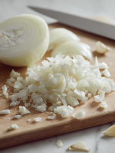 - Finely chop the onion and mince the garlic, filling the air with their savory aroma.