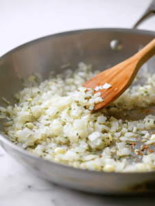 Step 4: In a skillet, sauté onions and garlic until soft, about 5 minutes, until fragrant and translucent.