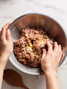 - In a large mixing bowl, combine the ground beef, cooked onion mixture, breadcrumbs, eggs, Worcestershire sauce, salt, and pepper. Use your hands to gently fold everything together until just combined — don’t overmix to keep it tender.