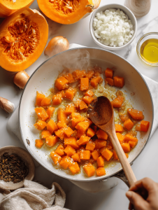 - Add the chopped pumpkin to the pan and cook, stirring occasionally, until it begins to soften and turn tender, about 8-10 minutes. The pumpkin should become velvety and slightly caramelized around the edges.