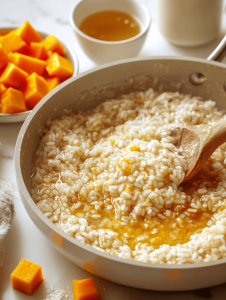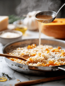 - Pour in a ladleful of warm vegetable broth and stir gently until the liquid is mostly absorbed, allowing the pumpkin to break down slightly.