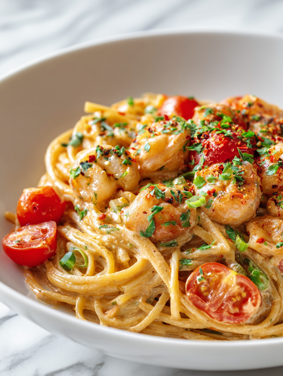 Focusing on the nostalgic comfort of creamy shrimp pasta, but with a twist—using a secret spice blend that transforms the dish into something unexpectedly fragrant and memorable, reminiscent of seaside markets and childhood dinners.