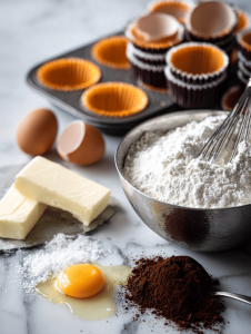 - Preheat your oven to 180°C (350°F) and line a muffin tin with orange or black paper liners to set the spooky mood.