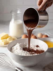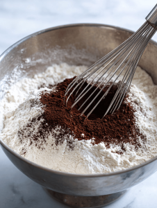 - In a large mixing bowl, whisk together the flour, cocoa powder, and sugar until well combined and slightly aerated.