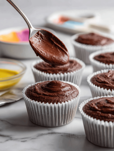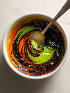 - Add a few drops of gel food coloring into the batter, gently swirling to create a marbled or spooky color effect without fully mixing in the color.
