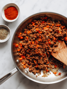 Step 7: Mix cooked meat with a splash of Worcestershire sauce, a dash of smoked paprika, and a pinch of cayenne.