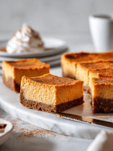 Pumpkin cheesecake bars combine the warm spices of fall with creamy cheesecake filling on a crunchy gingersnap crust. Baked to golden perfection, these bars have a smooth, dense texture with a slightly crisp base, making them a comforting and visually appealing dessert. They are easy to prepare ahead and perfect for sharing at gatherings or cozy nights at home.